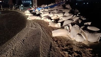 شهد الطريق الإقليمي المار بمحافظة المنوفية منذ قليل ، إنقلاب تريلا محمله بالدقيق مما أدي لغلق الطريق