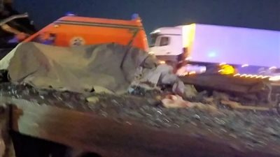 حصل “مصر تايمز” على الصور الأولى من موقع حادث تصادم أتوبيس تابع لشركة سوبر جيت وسيارتين نقل على الطريق الصحراوي