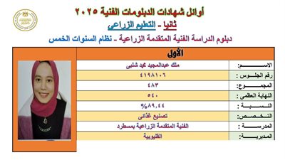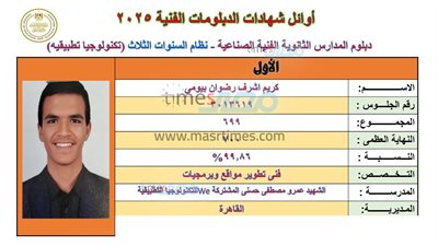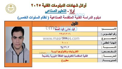 حصل الطالب محمد هانى محمد أحمد على المركز الأول دبلوم الفنى الصناعى بمجموع 99.7% من المدرسة الفنية لتكنولوجيا الطاقة النووية بمطروح نظام الخمس سنوات، والطالب ياسين عبد الجيد