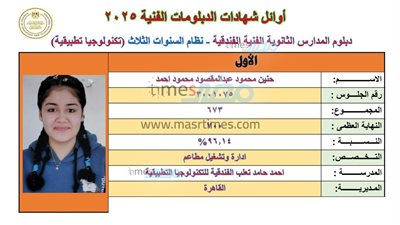 سيطرت حالة من السعادة والفرحة سيطرت على حنين محمود الأولى ضمن دبلوم المدارس الثانوية الفنية الفندقية تكنولوجيا تطبيقية بنسبة 96.14%، في محافظة القاهرة.