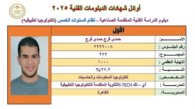 لحظة امتزجت فيها الدهشة بالفرحة، عبر الطالب حمدي فرج حمدي فرج، الحاصل على المركز الأول من أوائل شهادات الدبلومات الفنية، من محافظة القاهرة