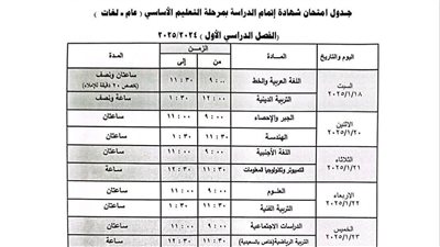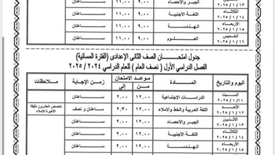حددت مديرية التربية والتعليم بالجيزة، جدول امتحانات الترم الأول 2025، للصف الثالث الإعدادي والتي ستبدأ يوم السبت الموافق 18 يناير