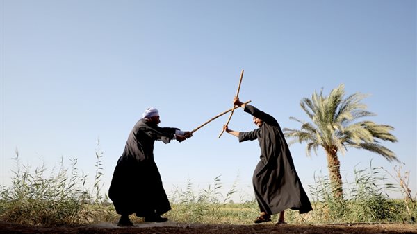الشمس، يجتمع عدد كبير من الشباب والشيوخ، ويلتفوا حول دائرة واسعة بها شخصان يحملان العصا ويقومان بالمبارزة
