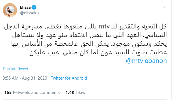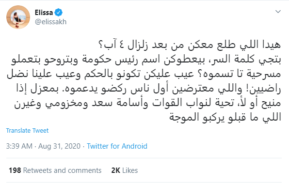 الفنانة اليسا على الوضع السياسى فى بلدهأ فسبق لها ان تفاعلت منع الوضع فى لبنان