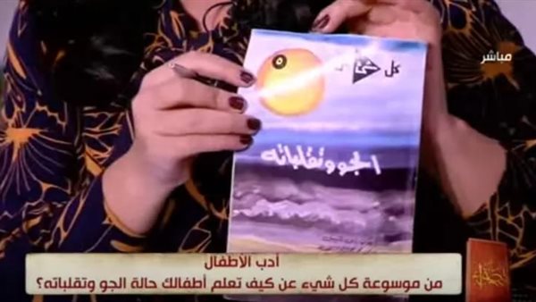 وأضافت الخلالي خلال تقديم حلقة اليوم، الخميس من برنامج "في المساء مع قصواء"، عبر شاشة "cbc"، أن هذا الكتيب يحكي عن الطقس وبداية التنبؤ بالأحوال الجوية مثل العواصف، وكيفية تحول الرياح إلى عواصف وقدرتها على التأثير في الأشياء من حولها مثل الأشجار.