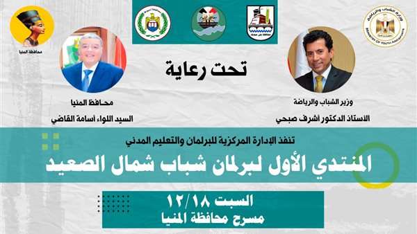 تطلق وزارة الشباب والرياضة، السبت المقبل، الموافق 18 من ديسمبر لعام 2021، فعاليات المنتدي الأول لشباب شمال الصعيد، بمسرح محافظة المنيا ، تحت رعاية الدكتور أشرف صبحي، وزير الشباب والرياضة، اللواء أسامة القاضي، محافظ المنيا، بحضور اللواء عصام سعد، محافظ أسيوط، الدكتور أحمد عبدالله الأنصاري، محافظ الفيوم، الدكتور محمد هاني غنيم، محافظ بني سويف.