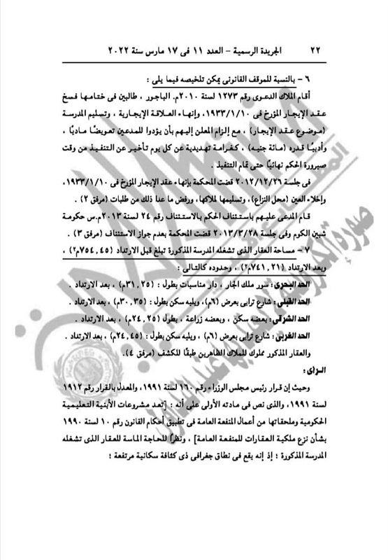 كما نشرت الجريدة الرسمية قرارات (732، و733، و734، و735، و735، و736، و737، 738) لسنة 2022، بشأن تخصيص قطع أرض من أملاك الدولة بالمجان لإاقمة وحدة غسيل كلوي بأسوان، وإقامة توسعات مدرسة بالدقهلية. وإقامة مكان لاحتجاز المركبات المضبوطة بالقليوبية، وإقامة محطة صرف صحي بسوهاج.