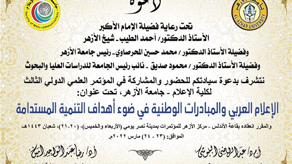 وأوضح الدكتور رضا أمين، عميد كلية الإعلام جامعة الأزهر، - أن المؤتمر يأتي برعاية الإمام الأكبر الدكتور أحمد الطيب شيخ الأزهر الشريف، والدكتور محمد المحرصاوي رئيس جامعة الأزهر، والأستاذ الدكتور محمود صديق نائب رئيس جامعة الأزهر للدراسات العليا والبحوث.