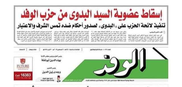 وكانت قد نشرت جريدة الوفد قرار إسقاط العضوية، وحصل "مصر تايمز" على نسخة منه، والذي كان كالتالي: "إسقاط عضوية السيد البدوي من حزب الوفد لتنفيذ لائحة الحزب عليه بسبب صدور أحكام ضده تمس الشرف والاعتبار”، في الصفحة الأولى لجريدة الوفد.