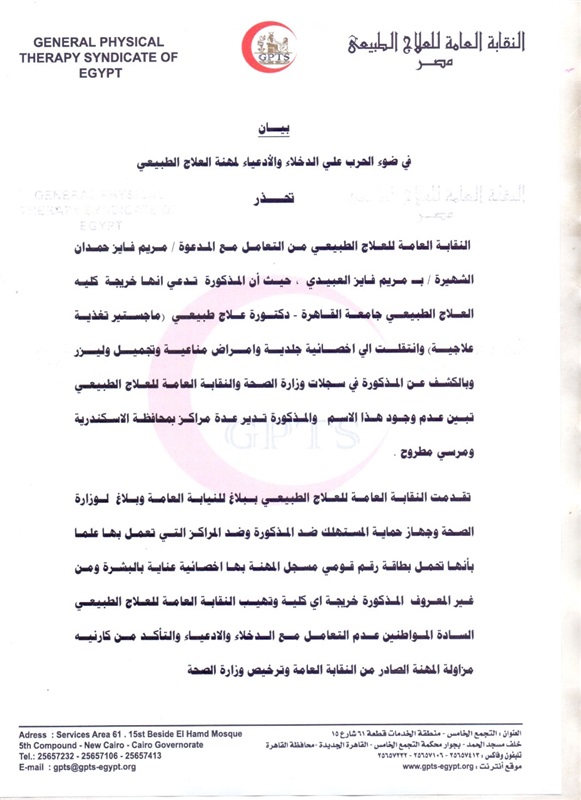 حذرت النقابة العامة للعلاج الطبيعي في بيان لها، من التعامل مع المدعوة مريم فايز حمدان، الشهيرة بـ"مريم فايز العبيدي"، نظرًا لادعائها بالتخرج من كلية العلاج الطبيعي جامعة القاهرة، وحاصلة على ماجستير تغذية علاجية، وانتقالها إلى أخصائية جلدية وأمراض مناعية وتحميل وليزر.