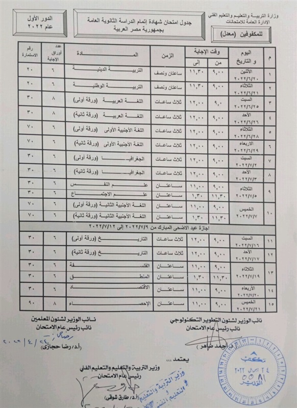 ووفقًا للجدول "المعدل" فإن الامتحانات سوف تبدأ يوم الاثنين الموافق 20 يونيو 2022، وتستمر حتى الخميس 21 يوليو 2022.