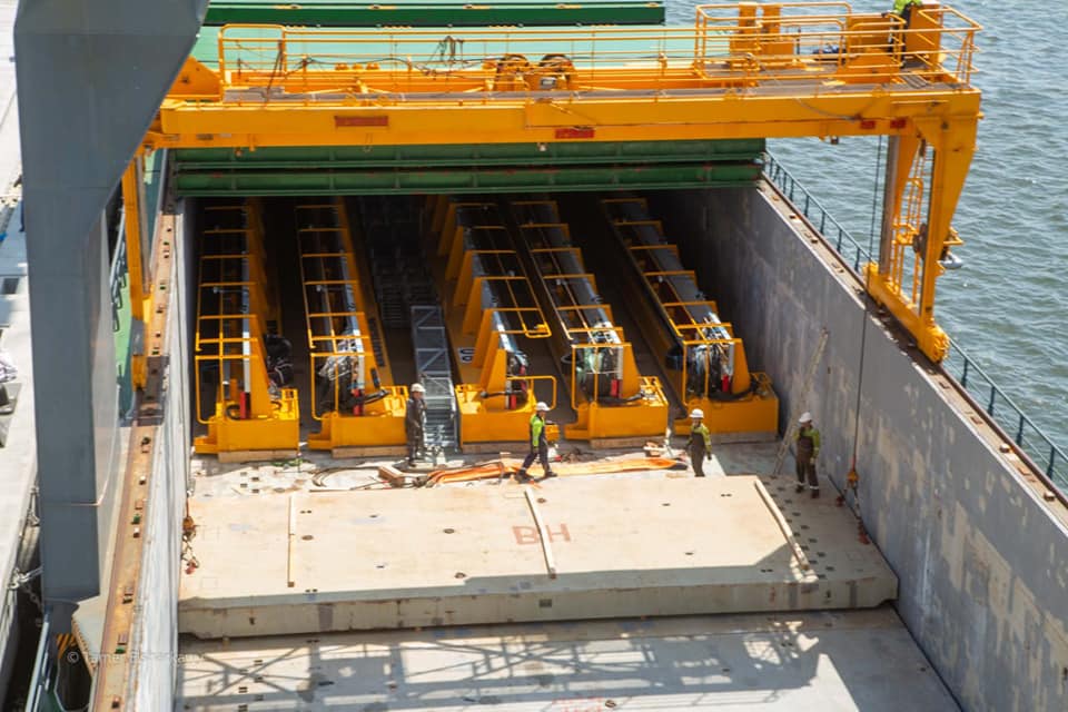 وحيث تعتبر هذه الاوناش هي الأولى فى مصر وتعمل باستخدام اقطاب التوصيل الكهربية و التى تستخدم فى التداول بالساحات الخاصة بالحاويات وحيث تم تفريغ مكونات الأوناش من السفينة على الأرصفة الخاصة بمحطة TMT والتى أصبحت جاهزة لاستقبال السفن وقد استغرقت عملية الانزال أربعة أيام تحت اشراف فريق من الخبراء من شركة Liebherr الألمانية وشركة تشغيل المحطة والعمالة المصرية المدربة لافتا أنه قد تم البدء في عملية تجميع هذه الأوناش على ساحة محطة TMT تحت إشراف نفس الفريق والمتوقع ان تصل مدة التركيب والتجهيز الى (6 أسابيع) من العمل الشاق .
