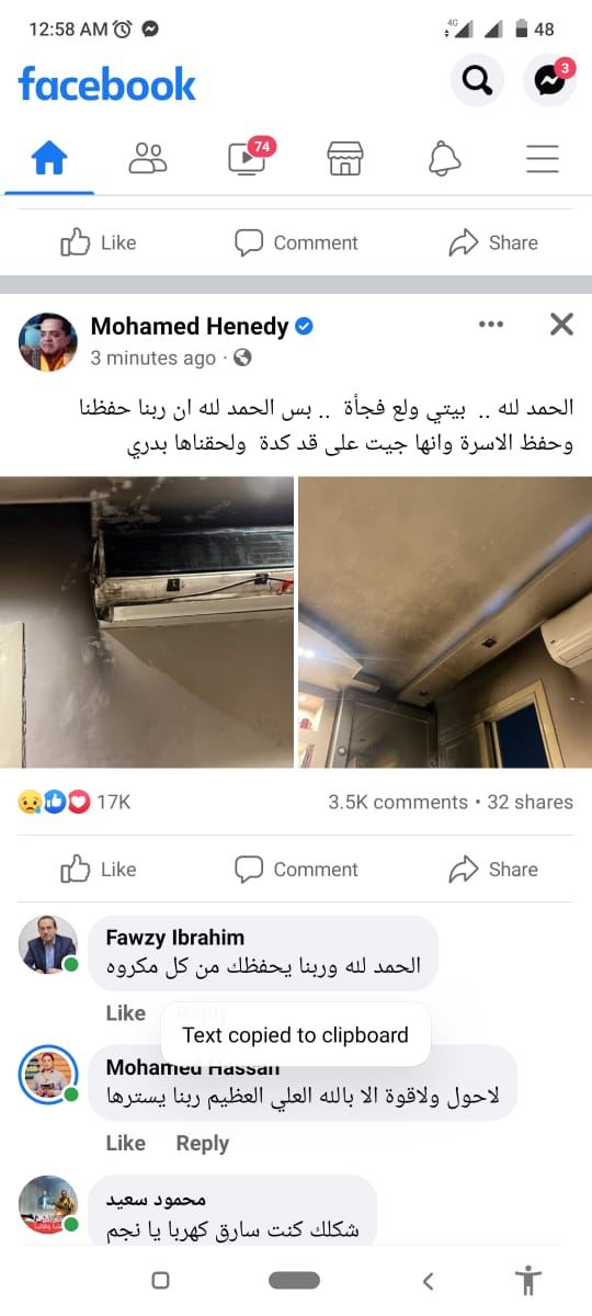 وقال الفنان محمد هنيدي بعد الحريق الذي شب في منزله ، “ محمد هنيدي: الحمد لله .. بيتي ولع فجأة .. بس الحمد لله ان ربنا حفظنا وحفظ الاسرة وانها جت على قد كدة ولحقناها بدري".