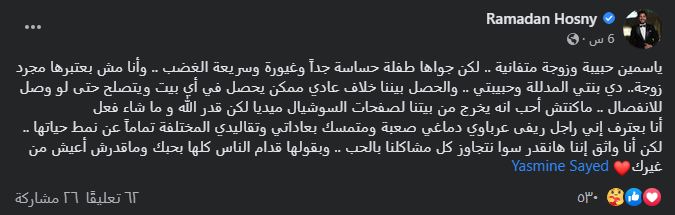 ونشر رمضان حسنى رجل الأعمال، عبر صفحته الشخصية على موقع التواصل الاجتماعي "فيس بوك"، قائلا" ياسمين حبيبة وزوجة متفانية.. لكن جواها طفلة حساسة جداً وغيورة وسريعة الغضب.. وأنا مش بعتبرها مجرد زوجة.. دي بنتي المدللة وحبيبتي.. واللى حصل بيننا خلاف عادي ممكن يحصل في أي بيت ويتصلح حتى لو وصل للانفصال.. ماكنتش أحب أنه يخرج من بيتنا لصفحات السوشيال ميديا لكن قدر الله و ما شاء فعل".