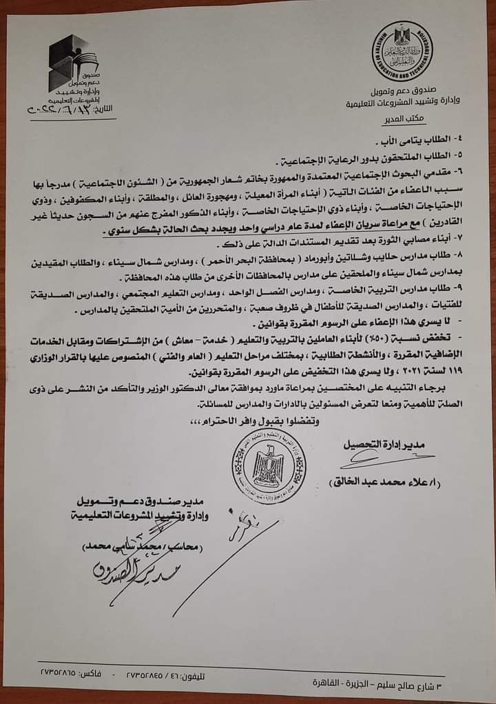 6- طلاب مدارس حلايب وشلاتين وأبورماد ( بمحافظة البحر الأحمر ) ، ومدارس شمال سيناء ، والطلاب المقيدين بمدارس شمال سيناء والملحقين على مدارس بالمحافظات الأخرى من طلاب هذه المحافظة . - طلاب مدارس التربية الخاصة ، ومدارس الفصـل الواحد ، ومدارس التعليم المجتمعي ، والمدارس الصـديقة للفتيات ، والمدارس الصديقة للأطفال في ظروف صعبة ، والمتحررين من الأمية الملتحقين بالمدارس . - لا يسري هذا الإعفاء على الرسوم المقررة بقوانين . - تخفض نسبة (50%) لأبناء العاملين بالتربية والتعليم ( خدمة - معاش ) من الإشتراكات ومقابل الخدمات الإضافية المقررة ، والأنشطة الطلابية ، بمختلف مراحل التعليم ( العام والفنى ) المنصوص عليها بالقرار الوزاري 119 لسنة 2021، ولا يسري هذا التخفيض على الرسوم المقررة بقوانين.