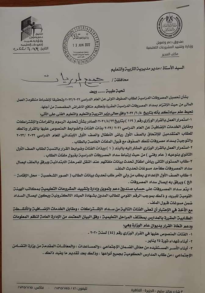 عممت وزارة التربية والتعليم والتعليم الفنى كتابا دوريا لضوابط تحصيل المصروفات الدراسية للعام الدراسي الجديد ٢٠٢٢م_٢٠٢٣؛ استمرار العمل بقانون رقم ١١٩ لسنه٢٠٢١ الصفوف الاول رياض الاطفال و الاول الابتدائى الصف الاول الثانوي العام والفنى مع تحديد الفئات المعاناه من المصروفات.