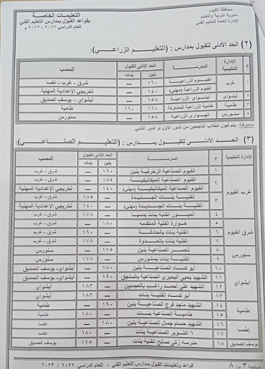 كما تراوحت درجات القبول بمدارس التعليم الفنى الصناعي، من 190 درجة إلى 175 درجة، عدا مدرستي الفيوم الصناعية الميكانيكية "مهني بنين" والفنية بنات الجديدة "مهني بنات" لخريجى الإعدادية المهنية، جاء الحد الأدنى للقبول بهما بمجموع140 درجة، فيما جاء الحد الأدنى للتنسيق بمدارس التعليم التجاري بمجموع درجات يتراوح من 165 درجة إلى 175 درجة، وبالنسبة للقبول بمدارس التعليم الفنية "خدمات" الفندقي والزراعي بمجموع 155 درجة، والصناعي 160 درجة، والتجاري 140 درجة.