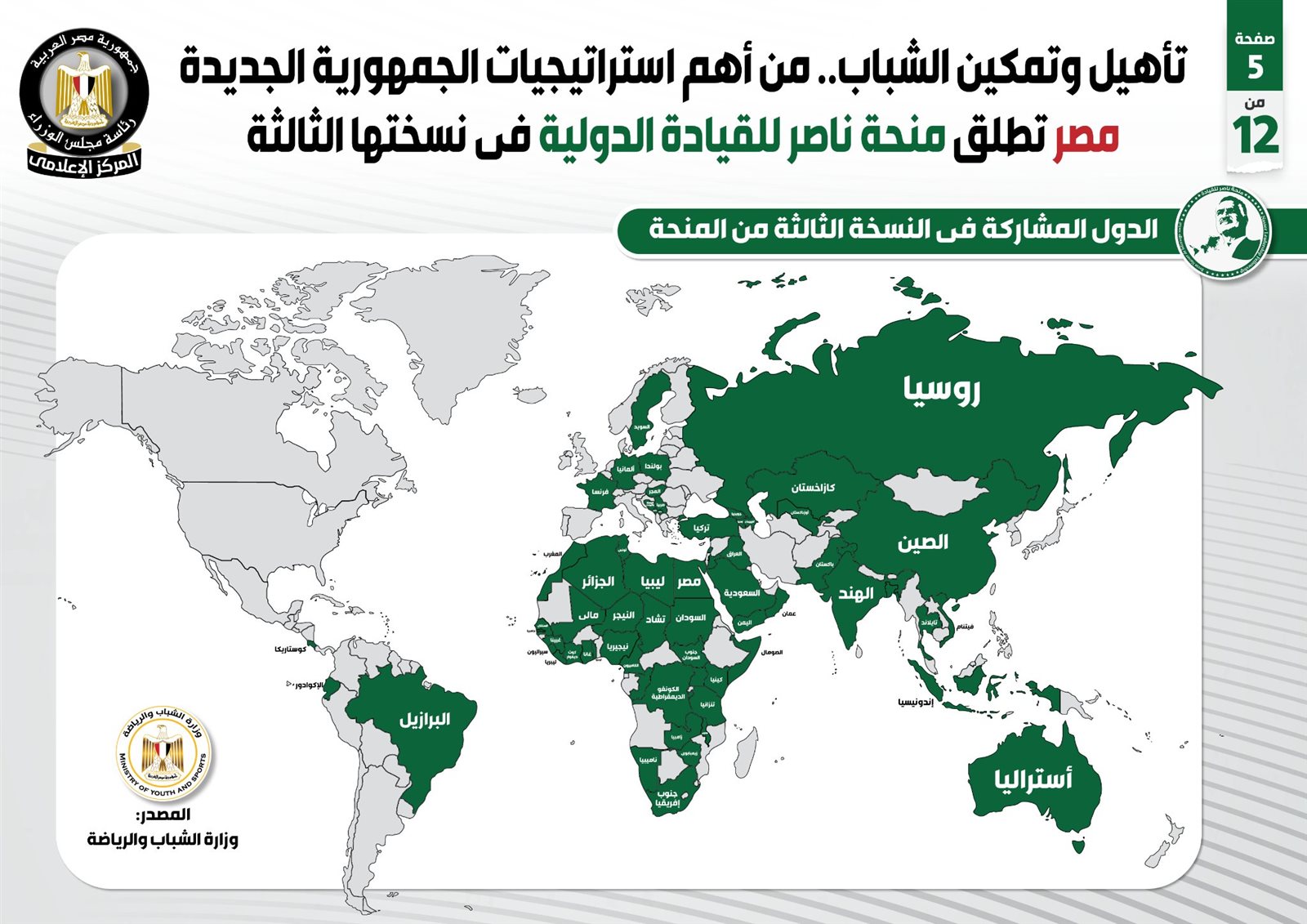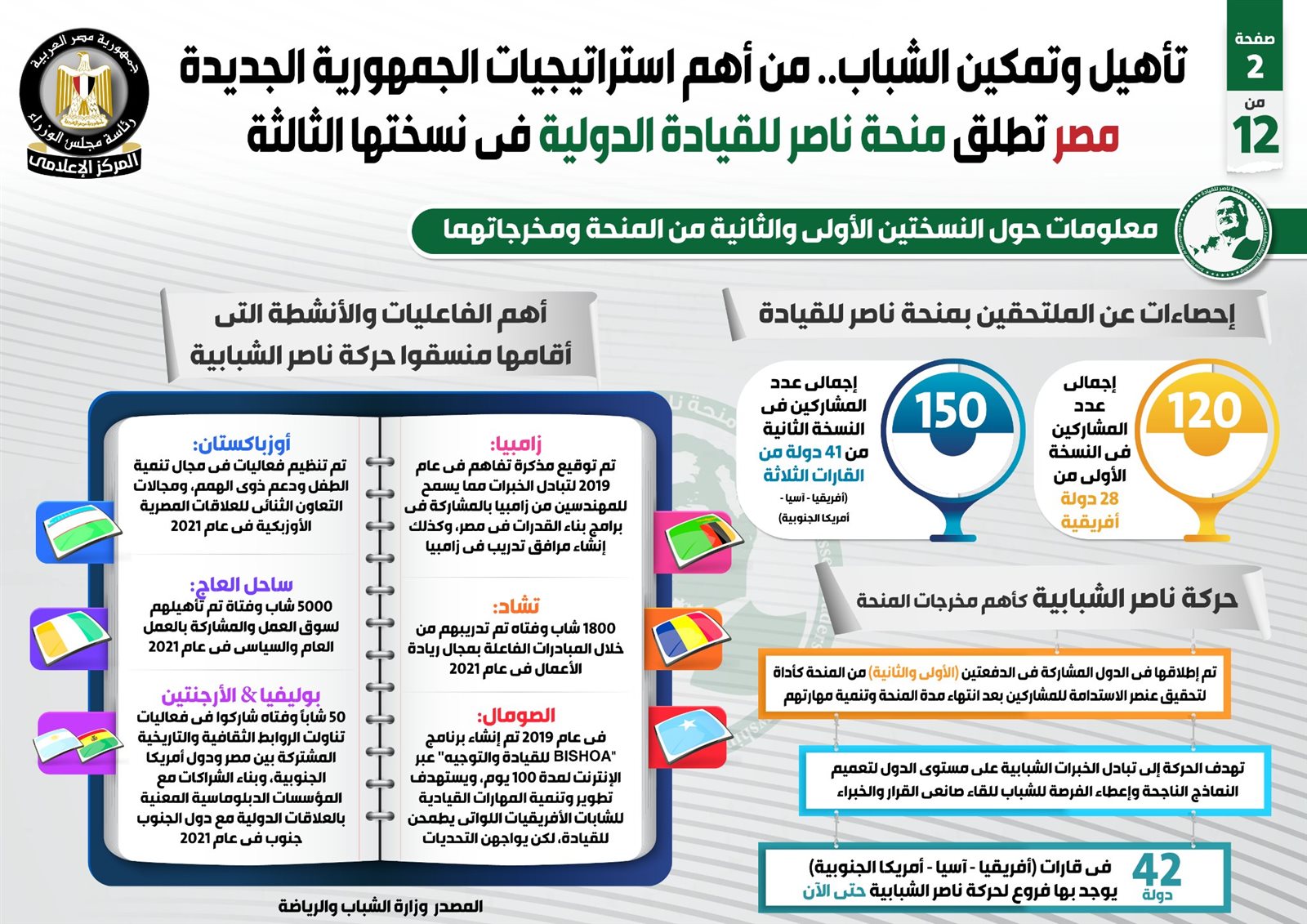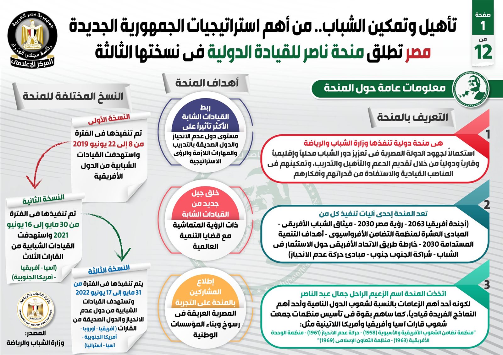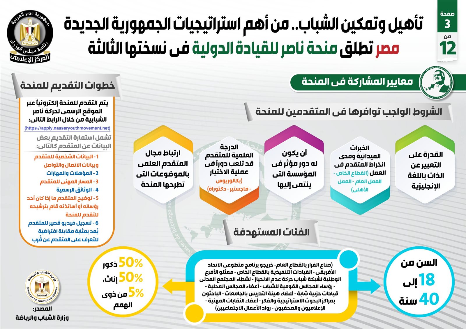 وفي هذا الصدد نشر المركز الإعلامي لمجلس الوزراء تقريراً تضمن إنفوجرافات تسلط الضوء على إطلاق النسخة الثالثة من منحة ناصر للقيادة الدولية، في إطار استراتيجية الجمهورية الجديدة لتأهيل وتمكين الشباب.
