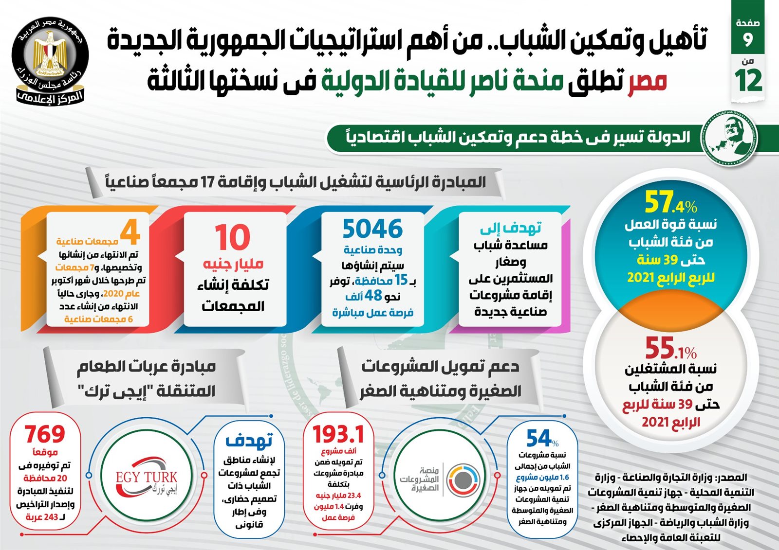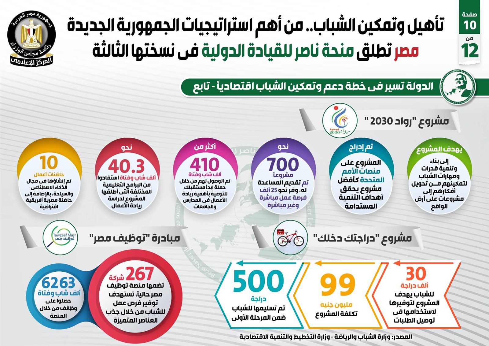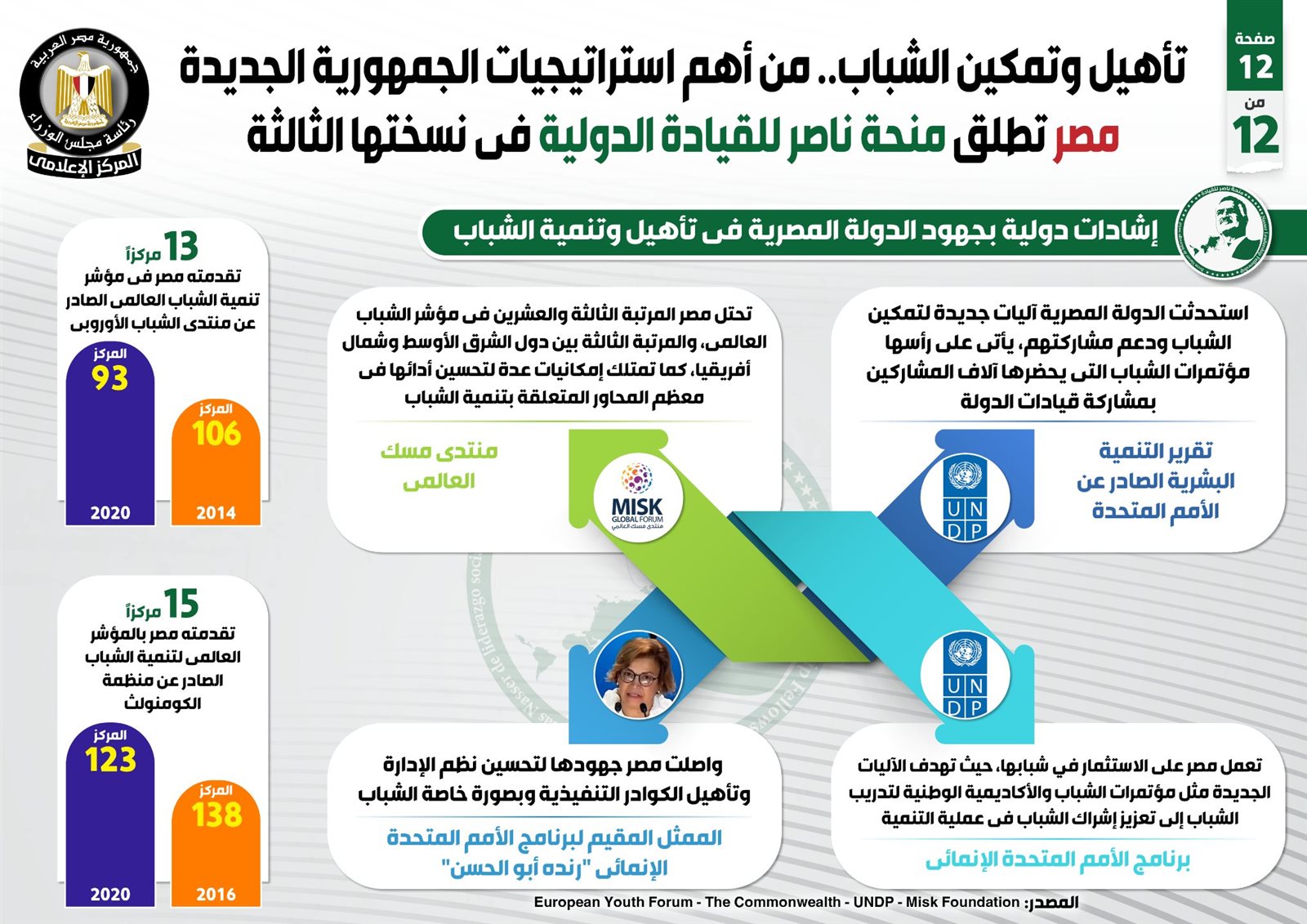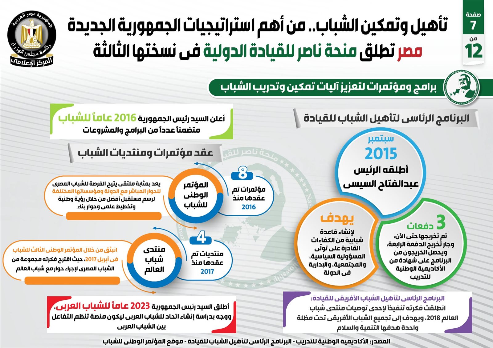 وفي هذا الصدد نشر المركز الإعلامي لمجلس الوزراء تقريراً تضمن إنفوجرافات تسلط الضوء على إطلاق النسخة الثالثة من منحة ناصر للقيادة الدولية، في إطار استراتيجية الجمهورية الجديدة لتأهيل وتمكين الشباب.