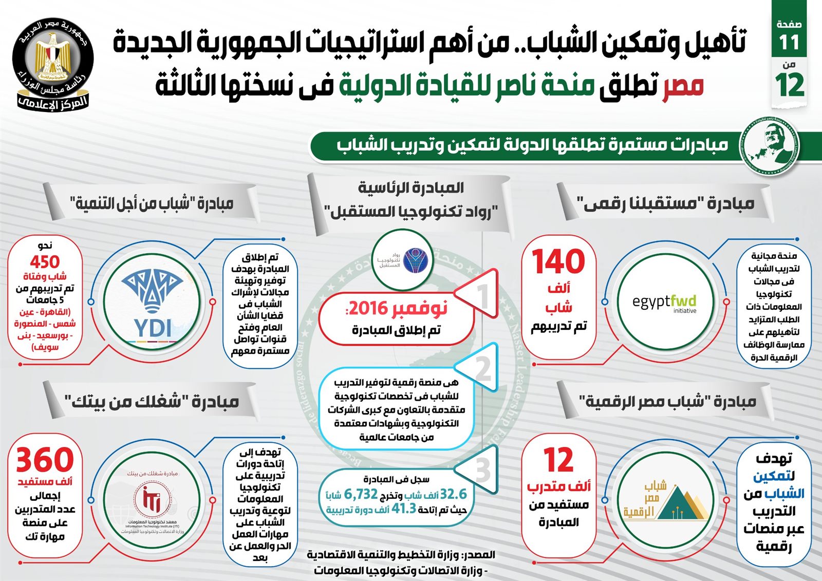 وأكد التقرير استمرار الدولة في إطلاق المبادرات لتمكين وتدريب الشباب، ومن بينها المبادرة الرئاسية "رواد تكنولوجيا المستقبل"، والتي تم إطلاقها في نوفمبر 2016، وتعد منصة رقمية لتوفير التدريب للشباب في تخصصات تكنولوجية متقدمة بالتعاون مع كبرى الشركات التكنولوجية وبشهادات معتمدة من جامعات عالمية، حيث وصل عدد المسجلين بها إلى 32.6 ألف شاب وتخرج 6732 شاباً، حيث تم إتاحة 41.3 ألف دورة تدريبية لهم.