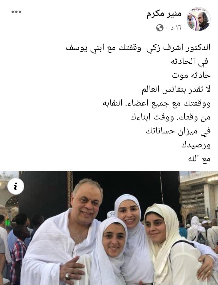 نشر منير مكرم عضو في نقابة المهن التمثيلية عبر صفحته الخاصة عبر موقع التواصل الإجتماعي"الفيسبوك" صورة لأسرة أشرف زكي وعلق عليها قائلا:" الدكتور أشرف زكي وقفتك من إبني يوسف في الحادثه، حادثة موت لا تقدر بنفائس العالم ووقفتك مع جميع الأعضاء النقابة من وقتك ووقت أبناءك في ميزان حسناتك، ورصيدك مع الله".