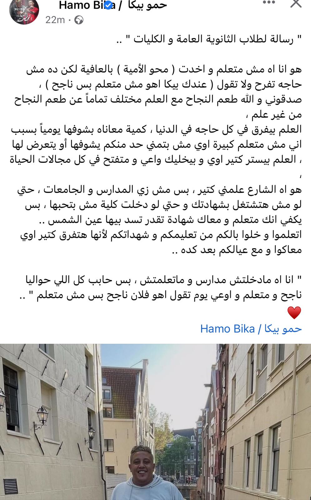نشر حمو بيكا عبر صفحته الشخصية عبر موقع التواصل الإجتماعي"الفيسبوك" منشورا عن طلاب الثانوية العامة وعلق عليها:" رسالة لطلاب الثانوية العامة و الكليات هو أنا أه مش متعلم و أخدت ( محو الأمية ) بالعافية لكن ده مش حاجه تفرح ولا تقول ( عندك بيكا أهو مش متعلم بس ناجح ) ، صدقوني و الله طعم النجاح مع العلم مختلف تماماً عن طعم النجاح من غير علم".