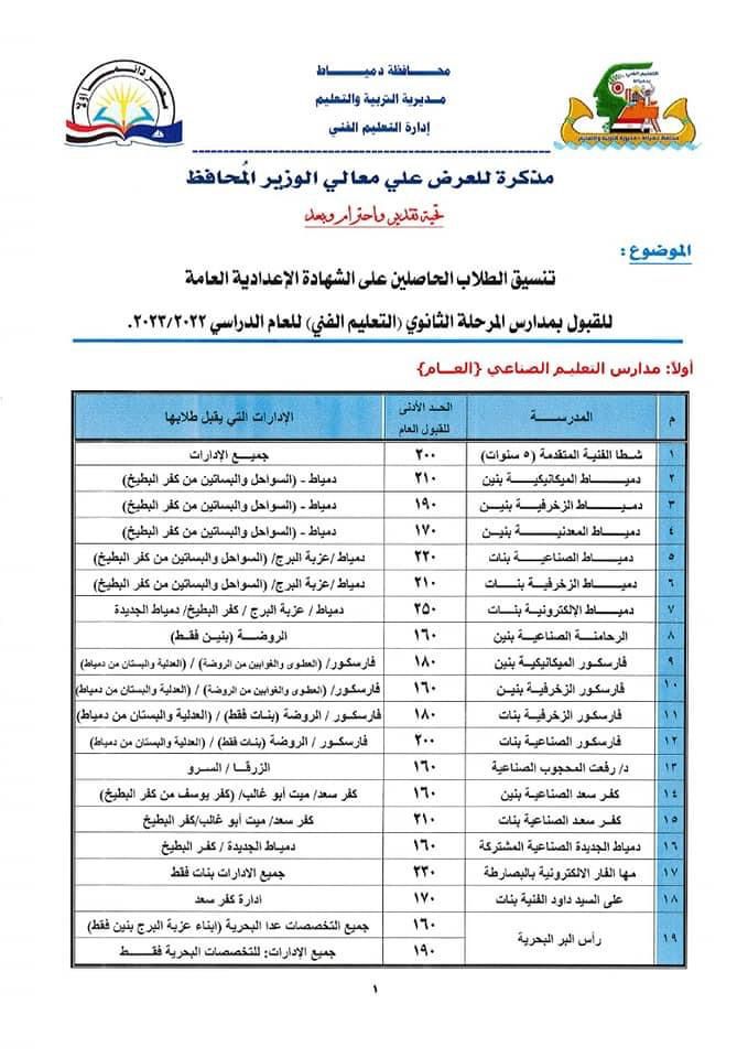 محافظ دمياط تعتمد تنسيق القبول بمدارس المرحلة الثانوية للتعليم الفنى