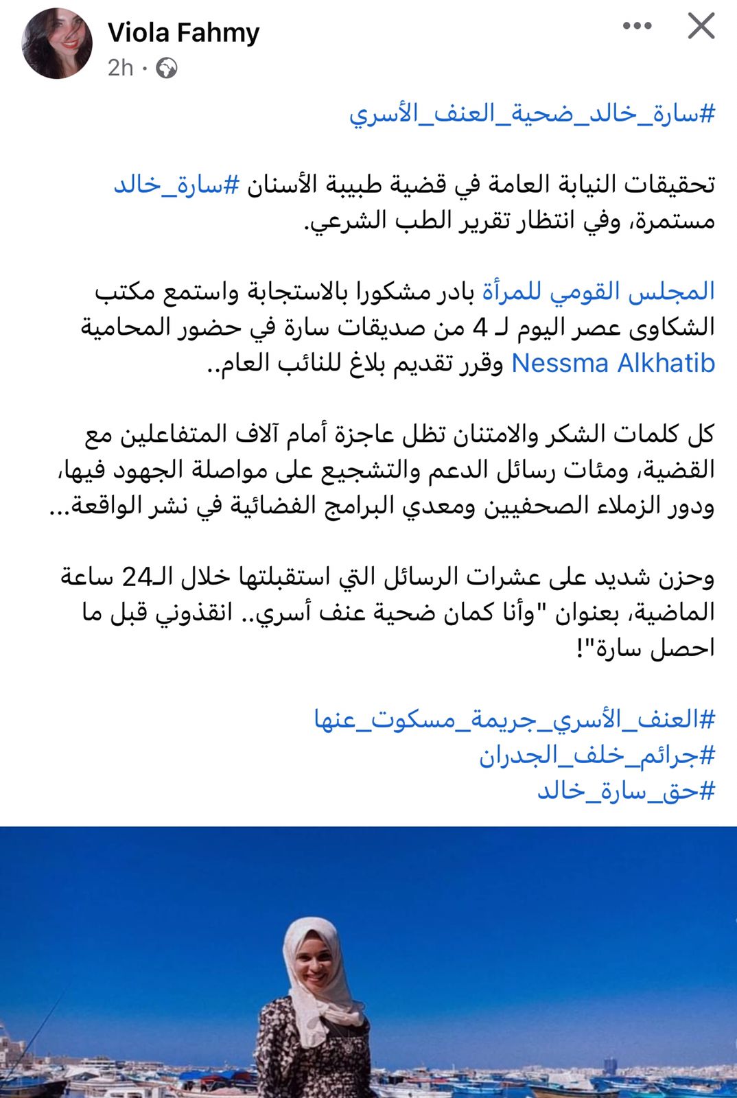 وقالت ،"أعلن احتفاظي بـ"اسكرينات" من سارة خالد على هاتفي الشخصي، بتأكد كلامي ومستعدة لتقديمها إلى جهات التحقيق في أي وقت.. وأدعو المجلس القومي للمرأة إلى التحرك والتدخل الفوري في القضية، لأن العنف الأسري قضية مجتمع..أنا مش هاكتم الشهادة يا سارة ومش هاسكت على حقك مهما حصل.. واعتبري دا وعد مني".