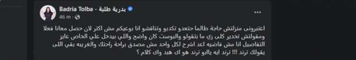 وقامت بدرية طلبة بحذف المنشور الذي كشفت فيه محاولة اختطاف ابنة شقيقها بعد أن تعرضت بدرية طلبة لانتقادات عديدة، ودافعت عن نفسها قائلة "اعتبروني مقولتش حاجة طالما حتقعدوا تكدبّوا وتناقشوا، أنا بوعيكم مش أكتر لأن حصل معانا فعلًا".