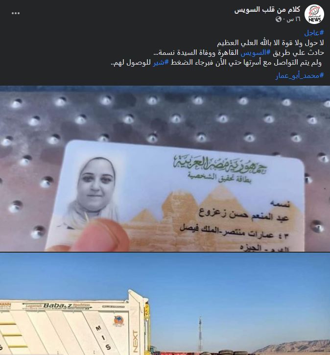 ونشرت إحدى الصفحات صورة بطاقتها، ومعها صور من حادث السيارة، للوصول إلى أسرتها، وكتب على الصورة: لا حول ولا قوة الا بالله العلي العظيم، حادث على طريق السويس القاهرة ووفاة السيدة نسمة، ولم يتم التواصل مع أسرتها حتى الآن.. فبرجاء الضغط شير للوصول لهم.