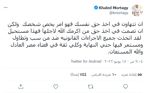 وكتب خالد مرتجي عضو مجلس الأهلي عبر صفحته الرسمية بموقع “تويتر”، “أن تتهاون في اخذ حق نفسك فهو امر يخص شخصك ولكن ان تصمت في اخذ حق من اكرمك الله لاجلها فهذا مستحيل ، لقد اتخذت جميع الاجراءات القانونيه ضد من سب وتطاول ومستمر فيها حتي النهاية وكلي ثقة في قضاء مصر العادل والله المستعان”.