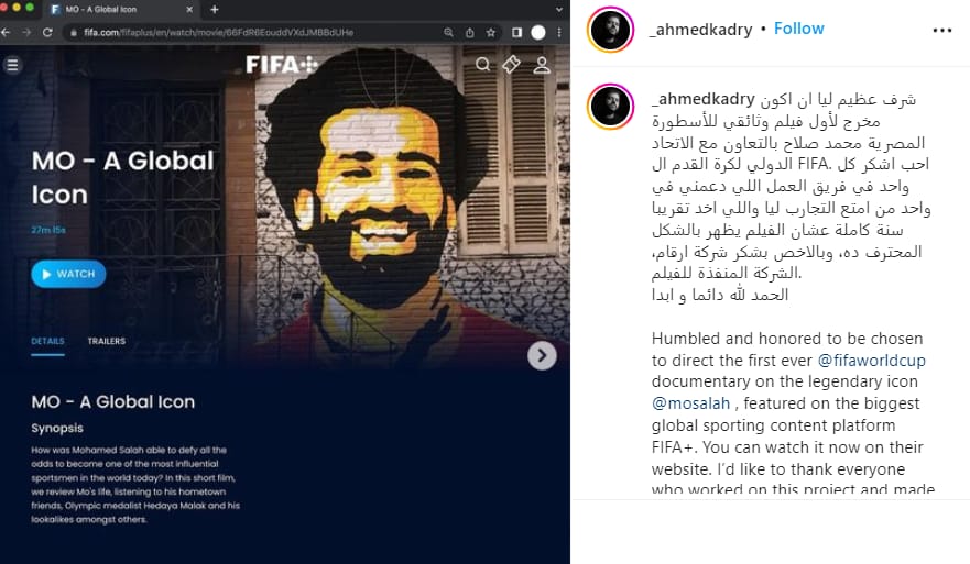 وقال قدري، عبر حسابه الخاص علي موقع التواصل الاجتماعي إنستجرام: "شرف عظيم ليا إن أكون مخرج لأول فيلم وثائقي للأسطورة المصرية محمد صلاح، بالتعاون مع الاتحاد الدولي لكرة القدم فيفا، أحب أشكر كل واحد في فريق العمل اللي دعمني في واحد من أمتع التجارب ليا واللي أخد تقريبا سنة كاملة عشان الفيلم يظهر بالشكل المحترف ده، الحمد لله دائما وأبدا.