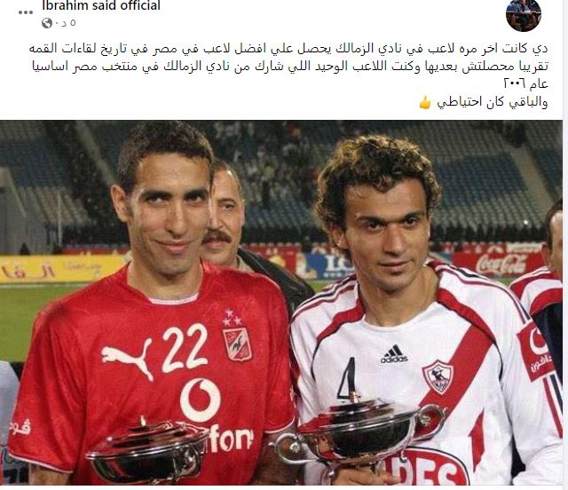 ونشر إبراهيم سعيد صورة على حساب الشخصي بموقع التواصل الاجتماعي "فيس بوك" وكتب عليها: "دي كانت اخر مره لاعب في نادي الزمالك يحصل علي افضل لاعب في مصر في تاريخ لقاءات القمه، تقريبا محصلتش بعديها وكنت اللاعب الوحيد اللي شارك من نادي الزمالك في منتخب مصر اساسيا عام ٢٠٠٦ ، والباقي كان احتياطي".