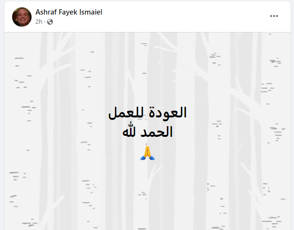 وعلق قائلًا:"العودة للعمل الحمد الله"،وأجرى المخرج أشرف فايق عملية قسطرة فى القلب، الخميس الماضى، وطمأن متابعيه بصور على حسابه على فيس بوك، حيث أعلن أنه بحالة جيدة، معتذرا على عدم رده على مكالمات ورسائل محبيه.