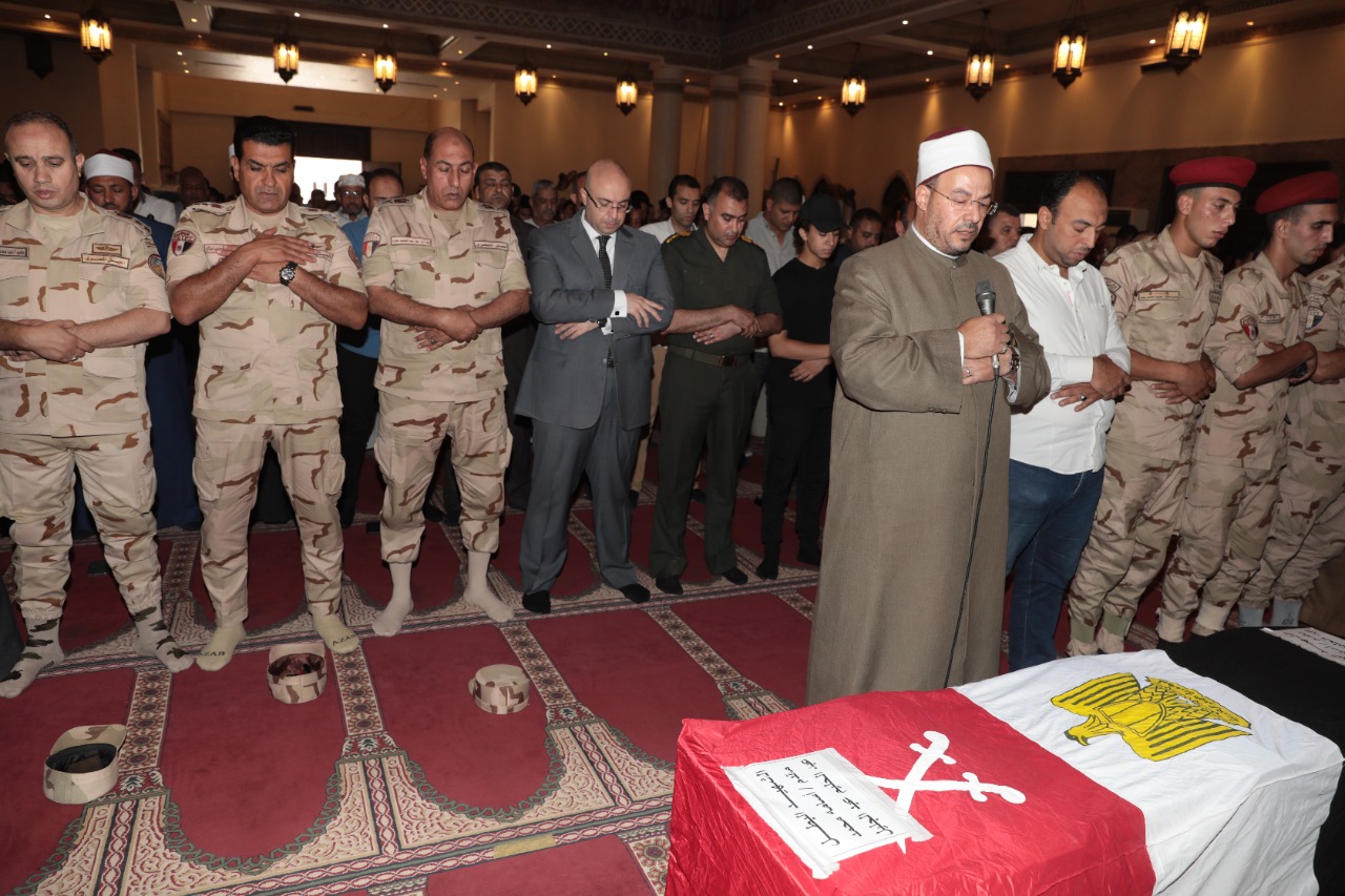 و أدى المحافظ ومرافقوه صلاتي الظهر والجنازة على جثمان الشهيد بالمسجد الكبير بمدينة بني سويف الجديدة شرق النيل ،وذلك في حضور اللواء علاء عمارة ، والعميد ياسر محجوب _من قيادات الجيش الثاني الميداني _، اللواء جمال مسعود السكرتير العام ،العقيد عيد محمود نائب المستشار العسكري للمحافظة ولفيف من القيادات الأمنية والعسكرية والتنفيذية ،حيث أقيمت جنازة عسكرية وشعبية مهيبة لشهيد الواجب انطلقت من أمام المسجد وسط مشاعر من الألم والحزن من أهالى وذوي الشهيد وجموع المشيعين.