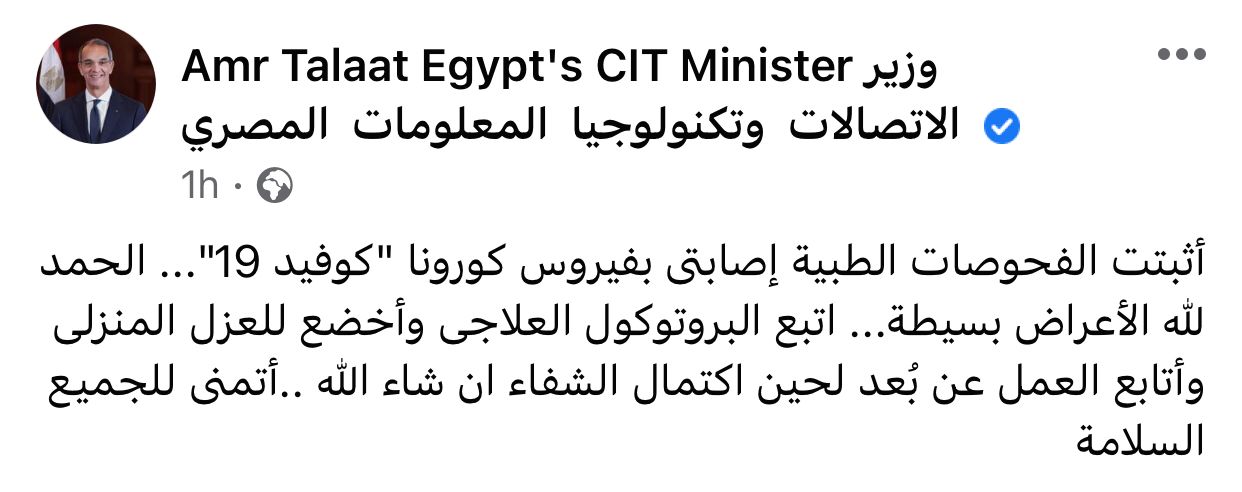 أعلن وزير الاتصالات وتكنولوجيا المعلومات الدكتور عمرو طلعت اليوم الأحد إصابته بفيروس كورونا.