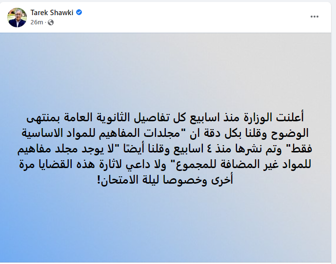 قال الدكتور طارق شوقي وزير التربية والتعليم والتعليم الفنى عبر صفحته الرسمية بموقع “فيس بوك"، أعلنت الوزارة منذ اسابيع كل تفاصيل الثانوية العامة بمنتهى الوضوح وقلنا بكل دقة ان "مجلدات المفاهيم للمواد الاساسية فقط" وتم نشرها منذ 4 أسابيع وقلنا أيضًا "لا يوجد مجلد مفاهيم للمواد غير المضافة للمجموع" ولا داعي لاثارة هذه القضايا مرة أخرى وخصوصا ليلة الامتحان!