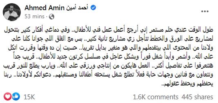 وكتب أمين عبر حسابه على فيسبوك: "طول الوقت عندي حلم مستمر إني أرجع أعمل عمل فني للأطفال، وفي دماغي أفكار كتير بتتحول لمشاريع على الورق والخطط تتأجل زي مشاريع تانية كتير".