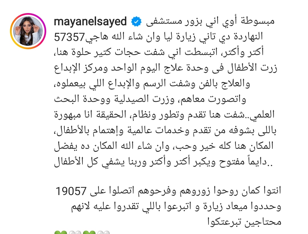 وعلقت الفنانة مايان السيد على الفيديو قائلة"مبسوطة أوي إني بزور مستشفى 57357 النهاردة دي تاني زيارة ليا وإن شاء الله هاجي أكتر وأكتر، اتبسطت إني شفت حجات كتير حلوة هنا".