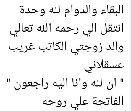 ونشر عبر صفحته الشخصية عبر موقع التواصل الإجتماعي “الفيسبوك” كتب قائلا:"لبقاء والدوام لله وحده انتقل إلى رحمه الله تعالي والد زوجتي الكاتب غريب عسقلاني إنا لله وإنا إليه راجعون الفاتحة على روحه".