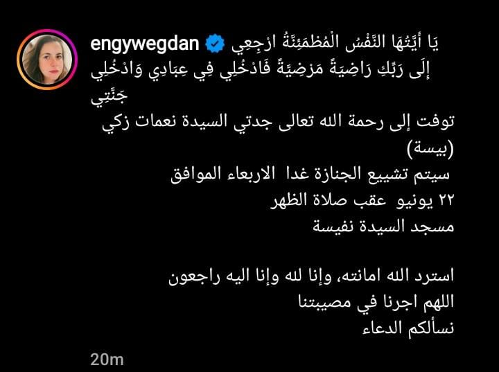 وكتبت إنجي وجدان عبر حسابها توفت إلى رحمة الله تعالى جدتي نعمات زكي (بيسه)، والمقرر تشييع جنازتها غدا الأربعاء بعد صلاة الظهر مسجد السيده نفيسه.