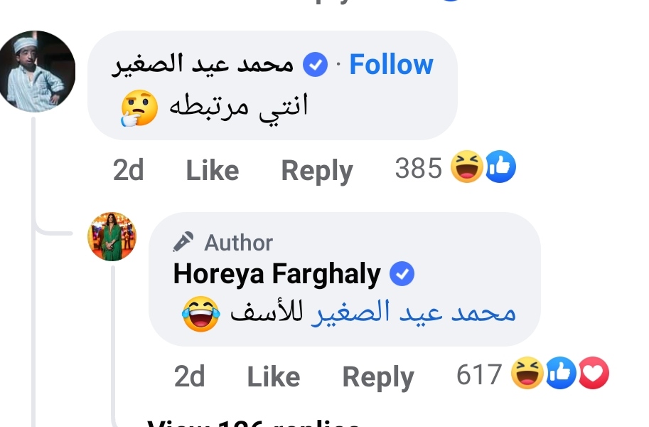 نشرت حورية فرغلي صورة لها على موقع التواصل الإجتماعي "الفيسبوك" وهي ترتدي فستان الإسودوعلقت عليها "وحشتوني" وعلق عيها الفنان محمد عيد الصغير قائلاً:"إنتي مرتبطة؟" لترد عليه حورية فرغلي “للأسف” وإمجي ضاحكاً.