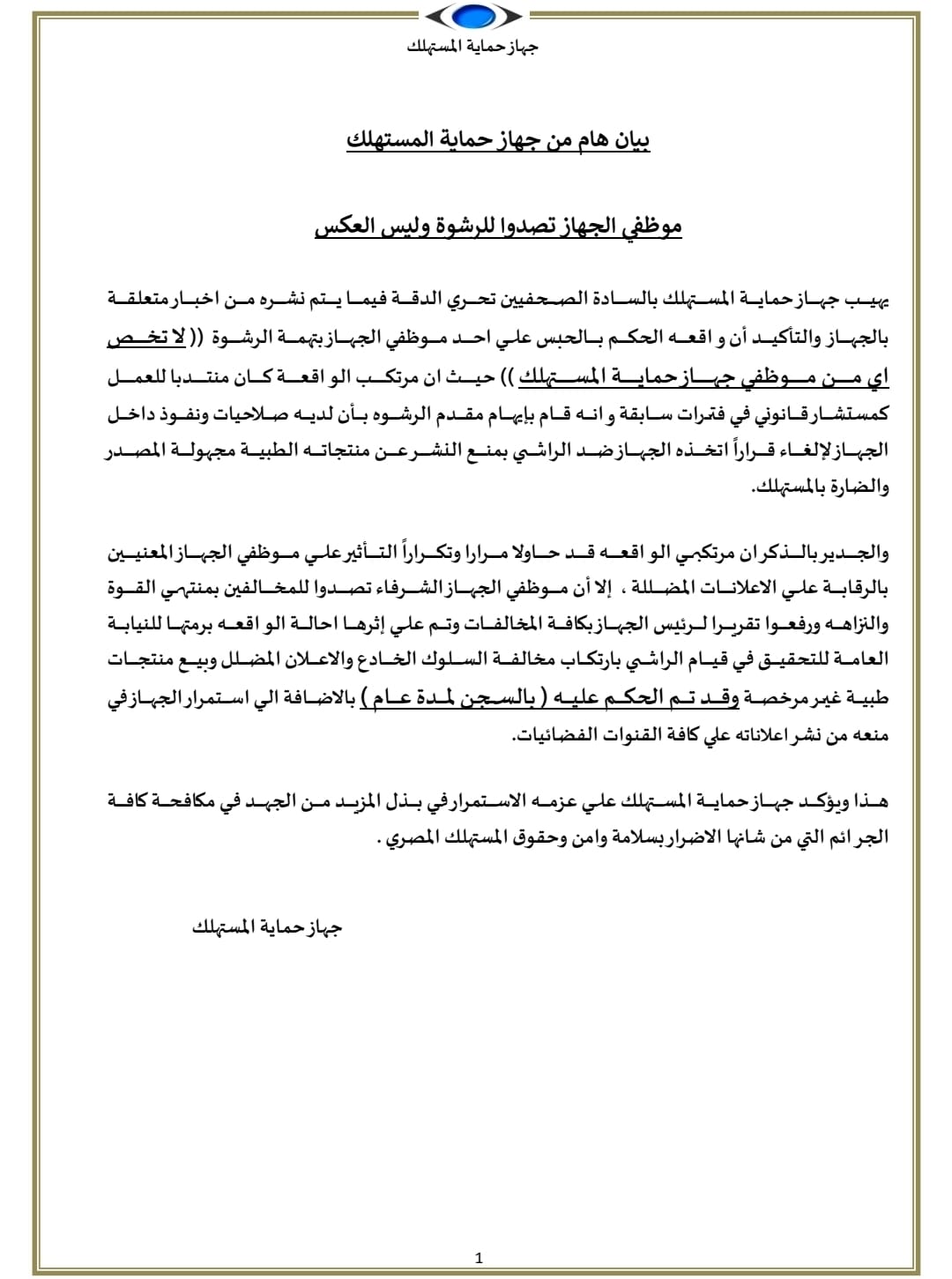 يُهيب جهاز حماية المستهلك بالسادة الصحفيين تحري الدقة فيما يتم نشره من اخبار متعلقة بالجهاز والتأكيد أن واقعه الحكم بالحبس علي احد موظفي الجهاز بتهمة الرشوة "لا تخص اي من موظفي جهاز حماية المستهلك" حيث ان مرتكب الواقعة كان منتدبا للعمل كمستشار قانوني في فترات سابقة وانه قام بإيهام مقدم الرشوه بأن لديه صلاحيات ونفوذ داخل الجهاز لإلغاء قراراً اتخذه الجهاز ضد الراشي بمنع النشر عن منتجاته الطبية مجهولة المصدر والضارة بالمستهلك.