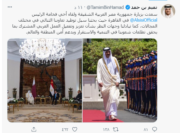 وكتب أمير قطر عبر صفحته الرسمية بموقع “تويتر”، “سعدت بزيارة جمهورية مصر العربية الشقيقة ولقاء أخي فخامة الرئيس عبد الفتاح السيسي في القاهرة حيث بحثنا سبل توطيد تعاوننا الثنائي في مختلف المجالات، كما تبادلنا وجهات النظر بشأن تعزيز وتفعيل العمل العربي المشترك بما يحقق تطلعات شعوبنا في التنمية والاستقرار ويدعم أمن المنطقة والعالم”.