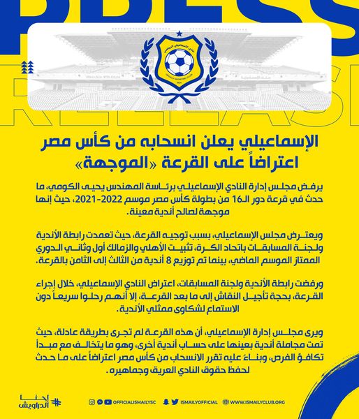 أعلن نادي الإسماعيلي الانسحاب من بطولة كأس مصر في نسختها الجديدة، موسم 2021-2022، بسبب ما وصفه بالقرعة الموجهة لصالح أندية معينة.