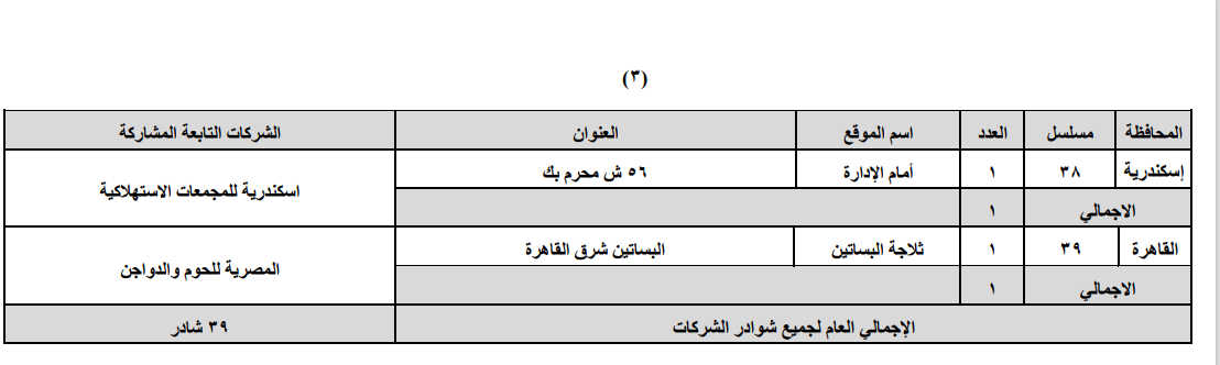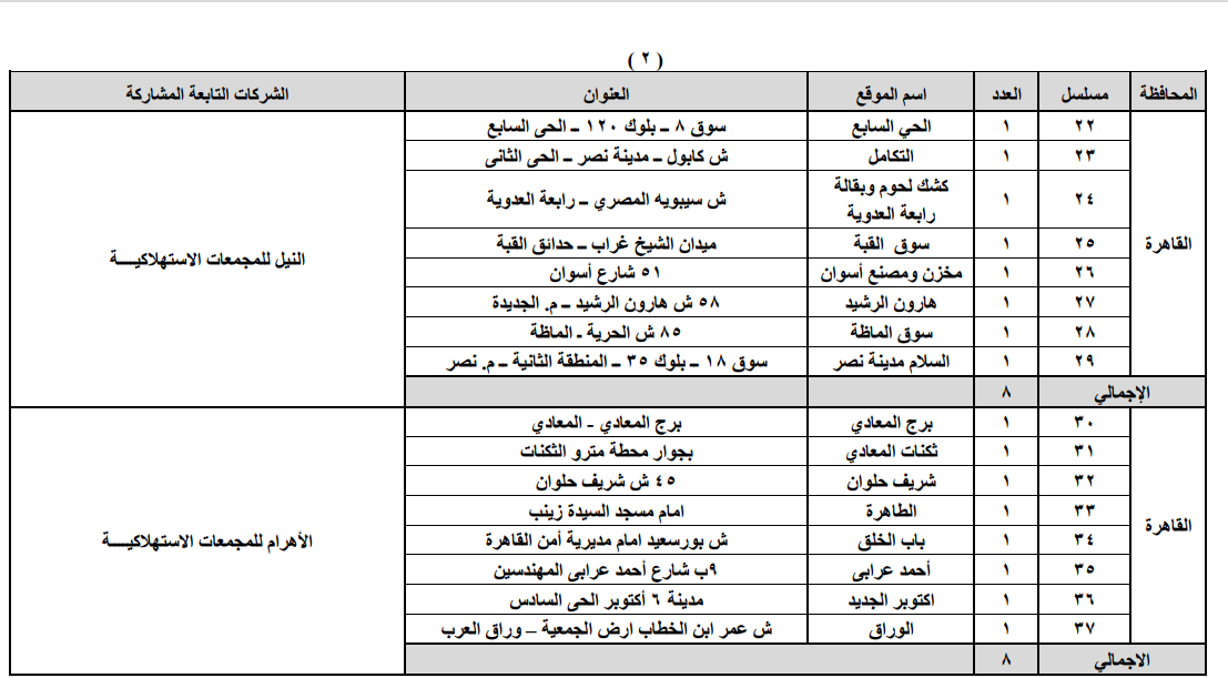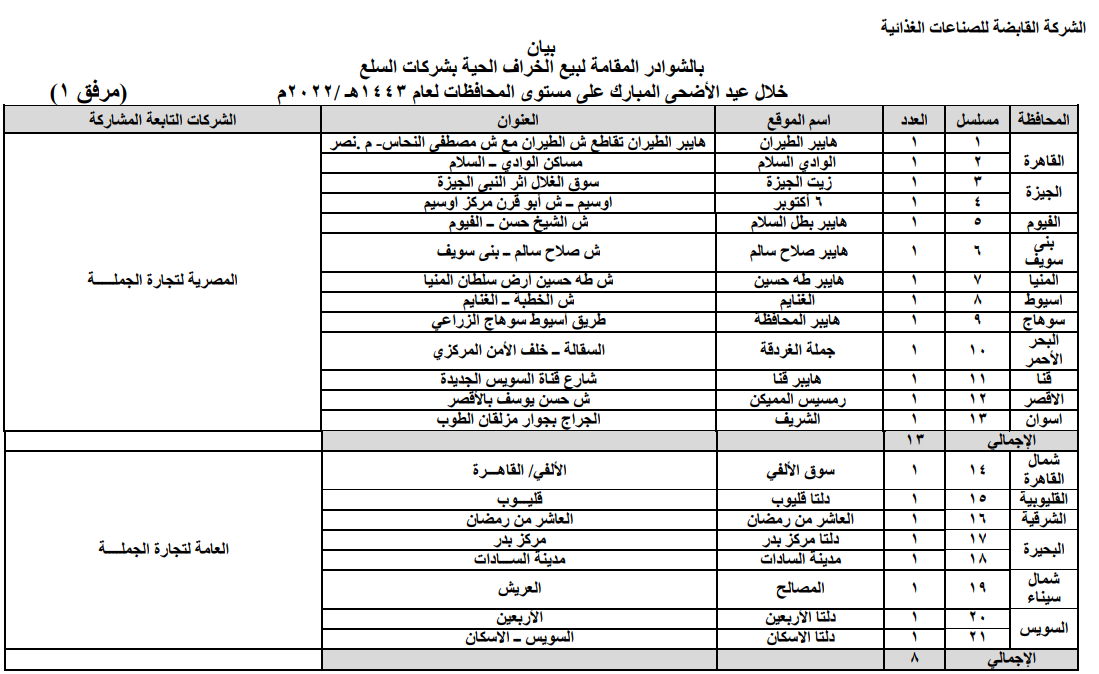 قائمة الشوادر المقامة لبيع الخراف الحية بمناسبة عيد الأضحى