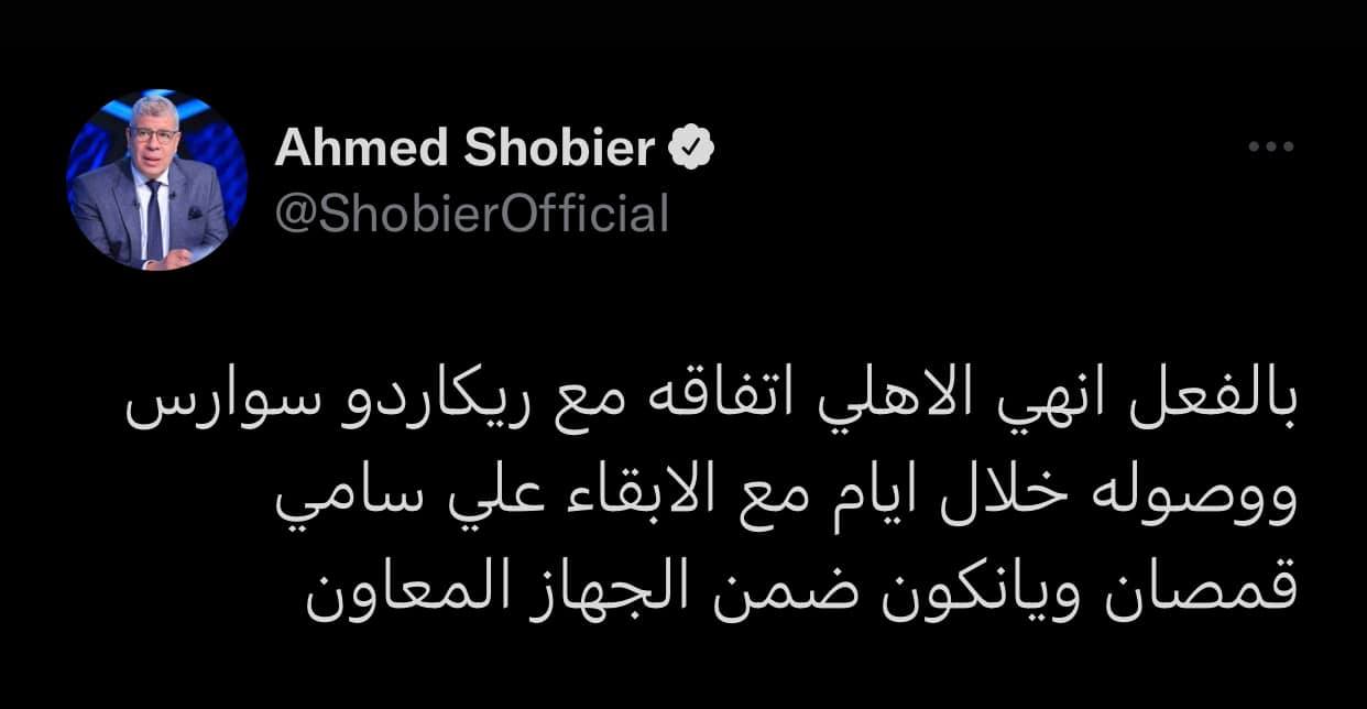 وكتب أحمد شوبير، عبر صفحته الرسمية على موقع التواصل الاجتماعي "تويتر": "بالفعل أنهي الأهلي اتفاقه مع ريكاردو سواريس ووصوله خلال أيام مع الإبقاء على سامي قمصان ويانكون ضمن الجهاز المعاون".