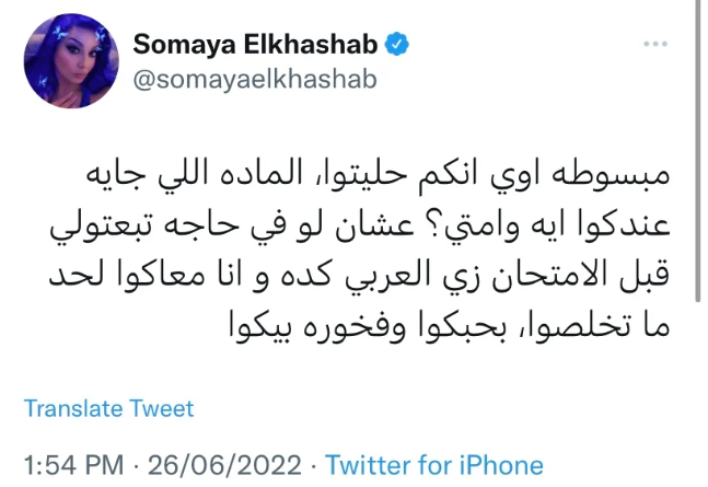 كتبت الفنانة سمية الخشاب عبر حسابها الرسمي بموقع التغريدات القصيرة "تويتر": "مبسوطه أوي إنكم حليتوا، المادة اللي جايه عندكوا إيه وامتي؟ عشان لو في حاجه تبعتولي قبل الامتحان زي العربي كده وأنا معاكوا لحد ما تخلصوا، بحبكوا، وفخورة بيكوا".