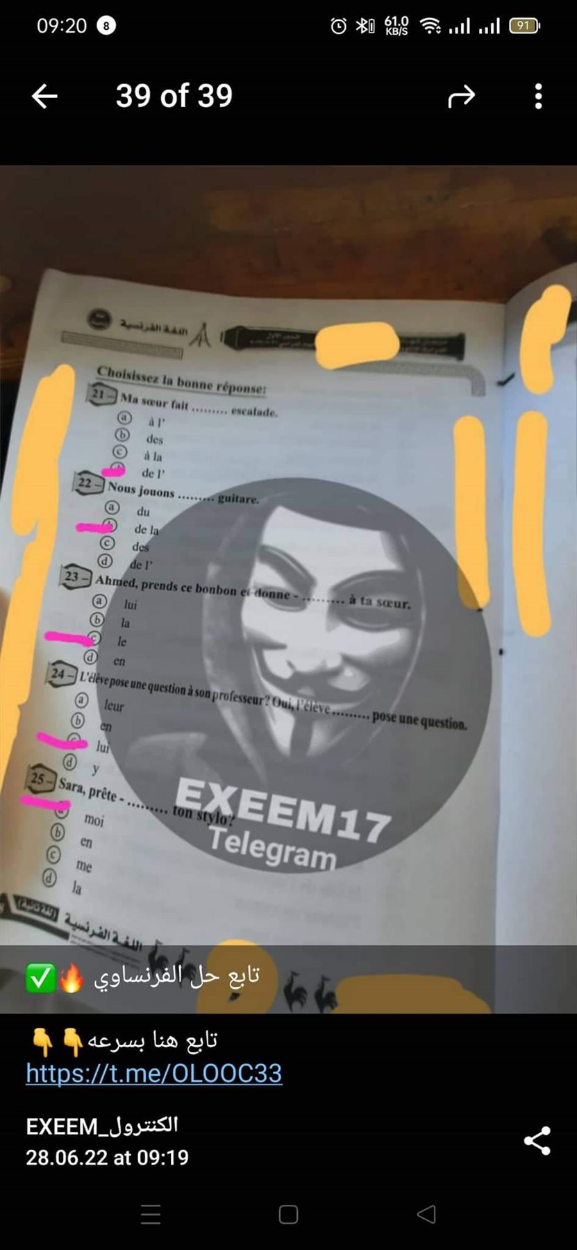 بعد مرور 20 دقيقة من بدء لجان الثانوية العامة تداولت اسئلة امتحان اللغة الفرنسية على جروبات التليجرام للغش.