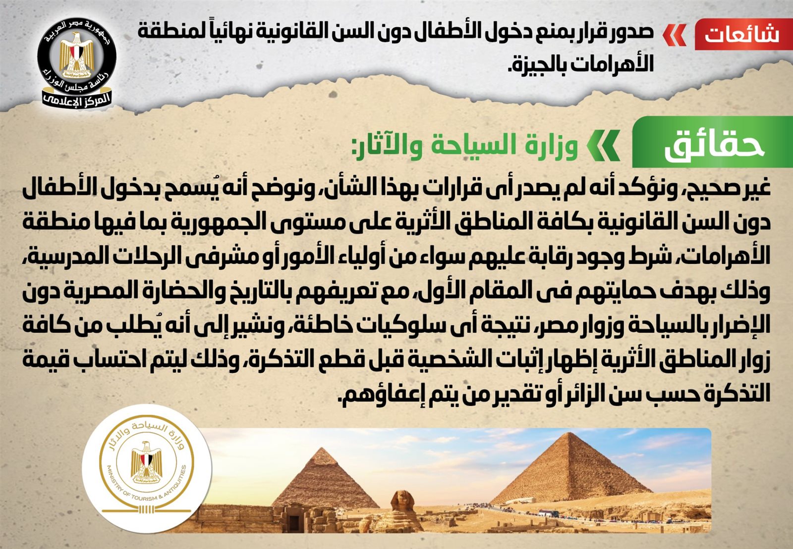 قام المركز الإعلامي لمجلس الوزراء بالتواصل مع وزارة السياحة والآثار، والتي نفت تلك الأنباء، مُؤكدةً أنه لا صحة لصدور قرار بمنع دخول الأطفال دون السن القانوني نهائياً لمنطقة الأهرامات بالجيزة، مؤكدةً أنه لم يصدر أي قرارات بهذا الشأن، مُوضحةً أنه يُسمح بدخول الأطفال دون السن القانونية بكافة المناطق الأثرية على مستوى الجمهورية بما فيها منطقة الأهرامات، شرط وجود رقابة عليهم سواء من أولياء الأمور أو مشرفي الرحلات المدرسية، وذلك بهدف حمايتهم في المقام الأول، مع تعريفهم بالتاريخ والحضارة المصرية دون الإضرار بالسياحة وزوار مصر، نتيجة أي سلوكيات خاطئة، مُشيرةً إلى أنه يُطلب من كافة زوار المناطق الأثرية إظهار إثبات الشخصية قبل قطع التذكرة، وذلك ليتم احتساب قيمة التذكرة حسب سن الزائر أو تقدير من يتم إعفاؤهم.